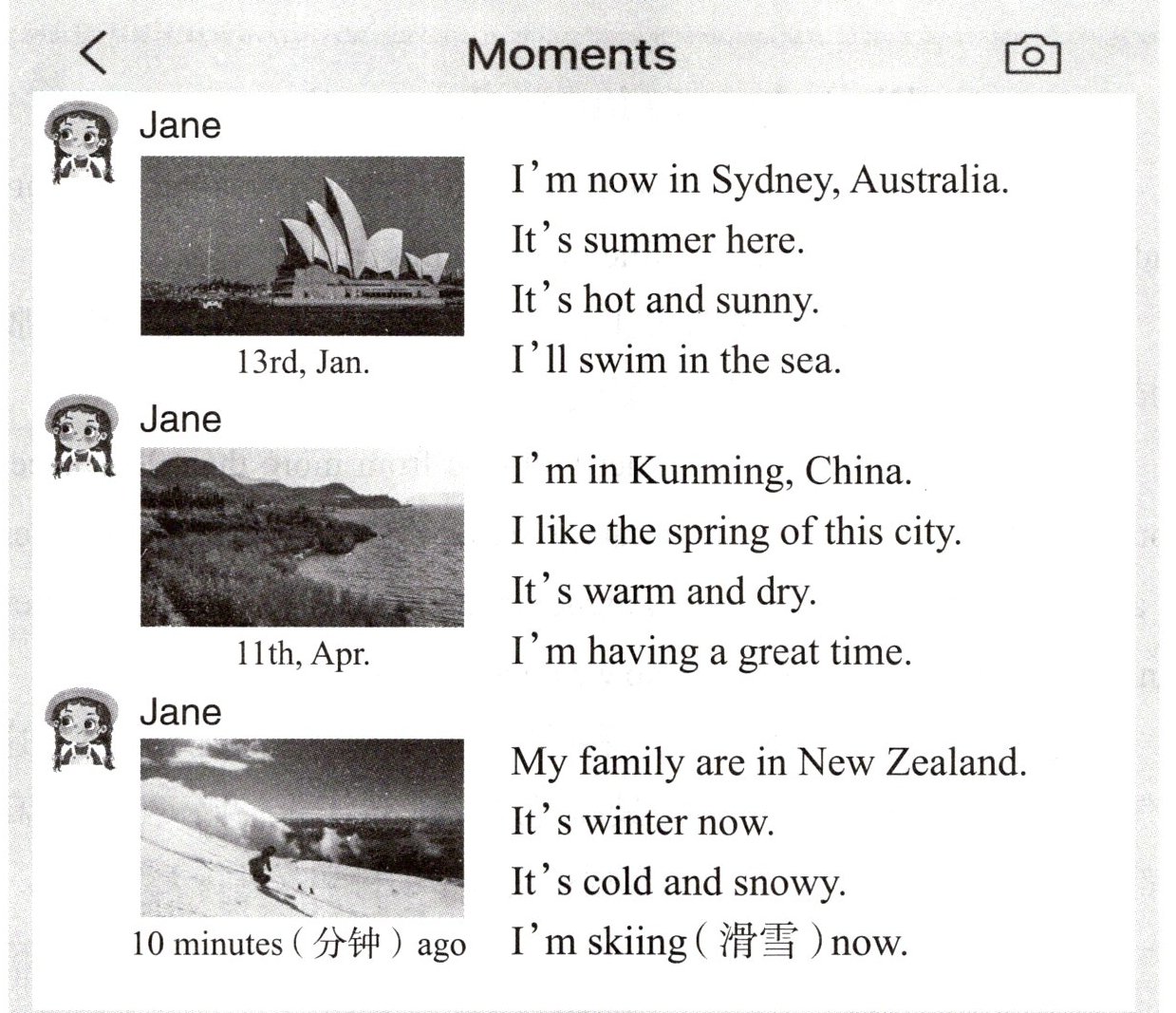 读短文,按时间先后顺序给 Jane 旅游期间曾去过的国家排序,并在横线上用英文写出当地的季节与天气。