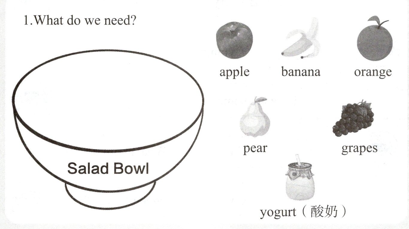 看图片,画出你需要的原材料。然后根据沙拉的制作步骤,在句子前的圆圈里标上数字序号。