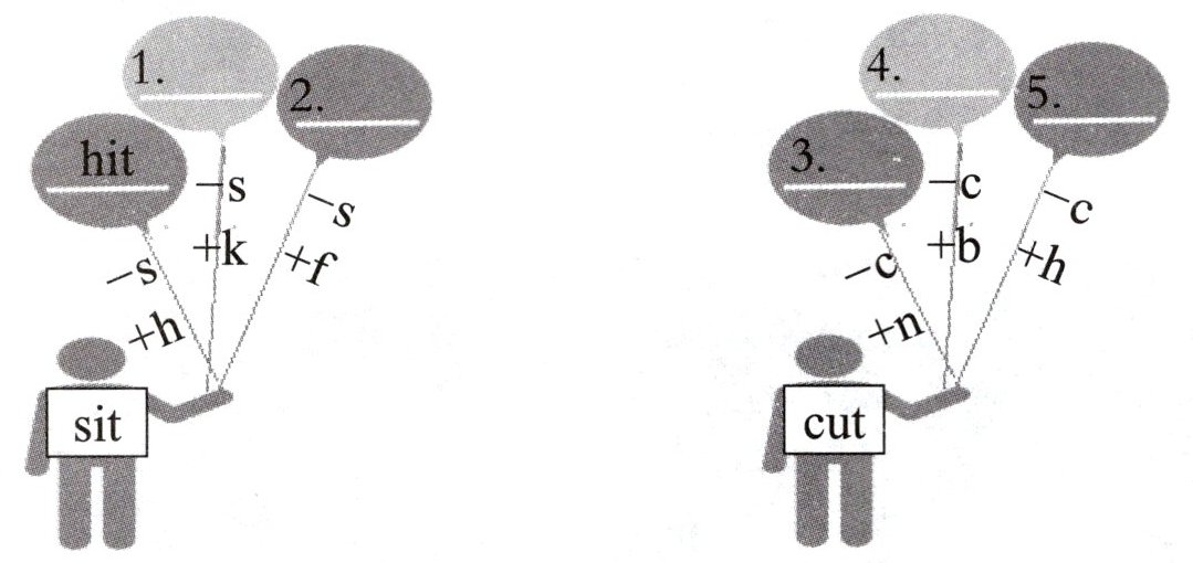 看图片,仿照例子在气球的横线上写出新单词并大声朗读。