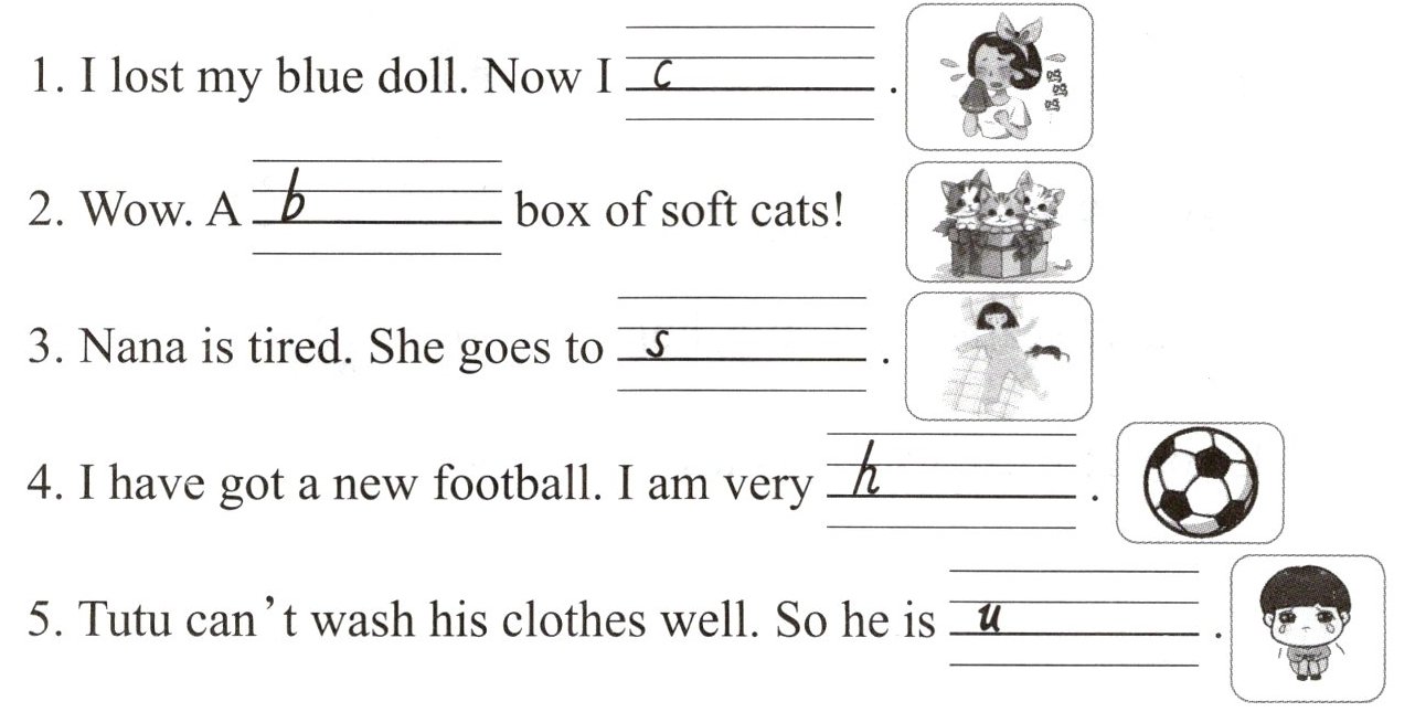 读句子,根据图片和首字母提示,将正确的单词写在四线格内。