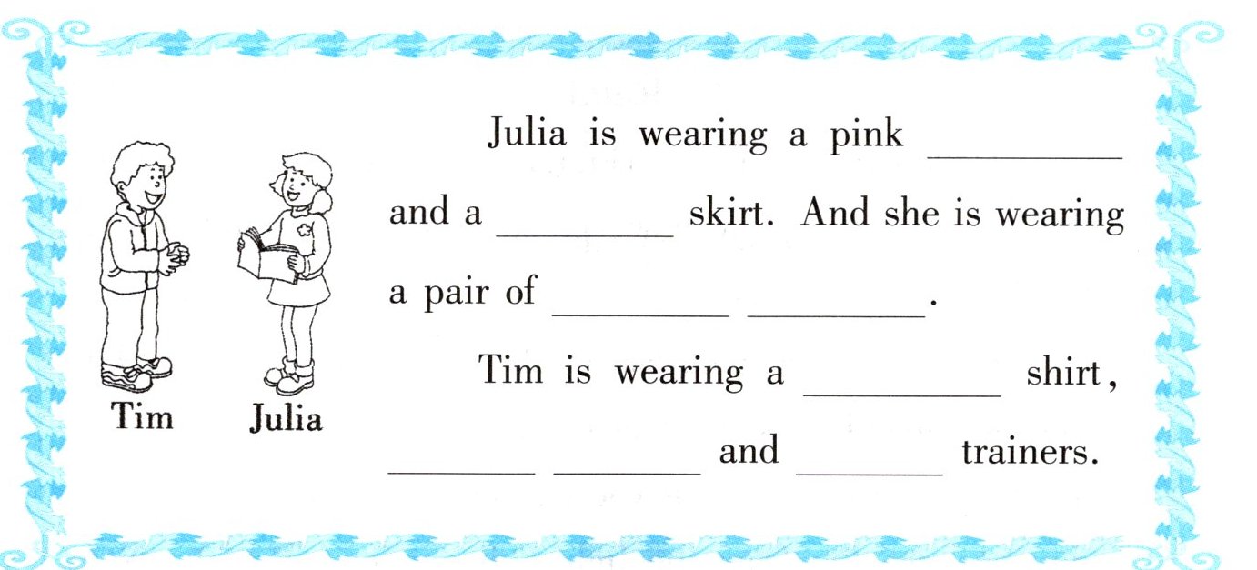 请给 Julia 和 Tim 的衣服涂上颜色,并将短文补充完整。