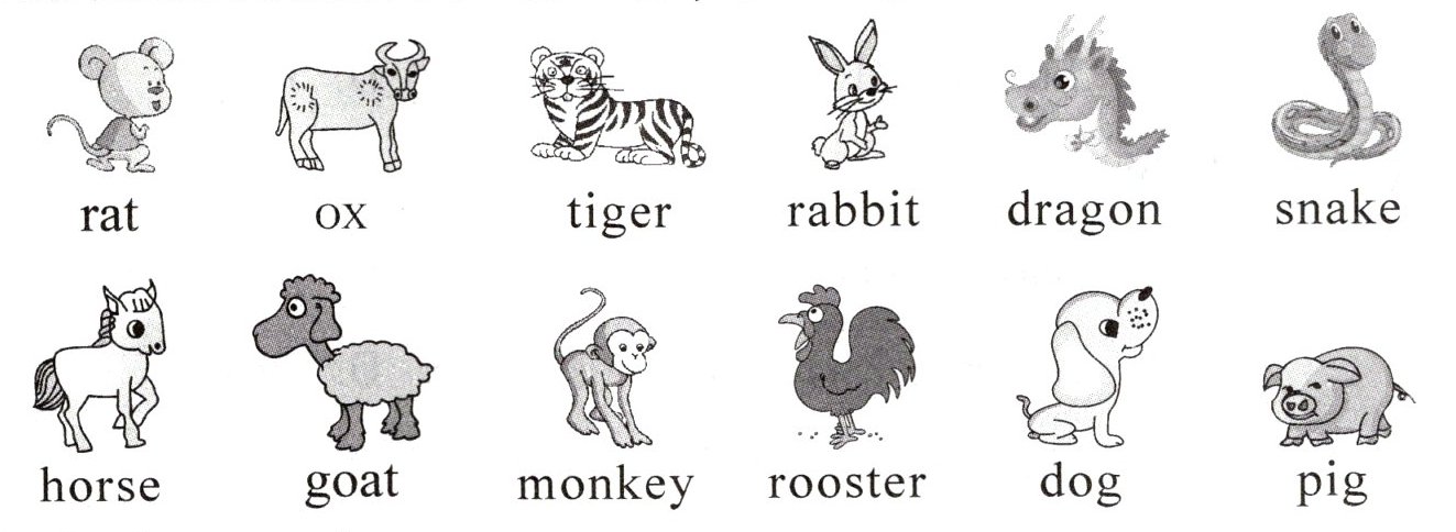 读一读十二生肖动物的英语名称。你的属相是什么?你的父母