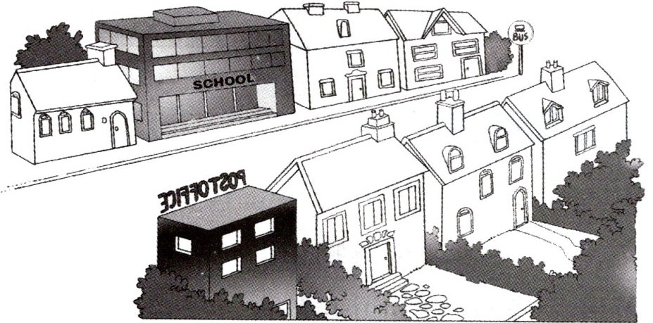 邮局一侧房屋:粉色;绿色;红色(从左到右)