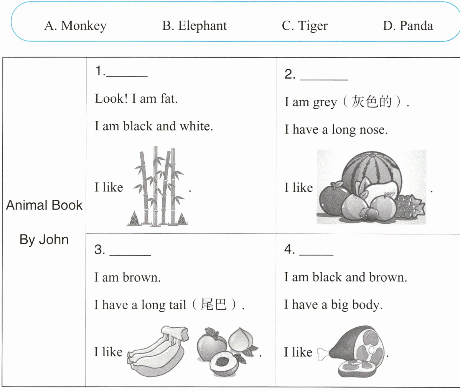 任务一:帮助John找到正确的动物名称选项,将其序号填在横线上,完成第1~4小题。