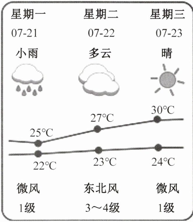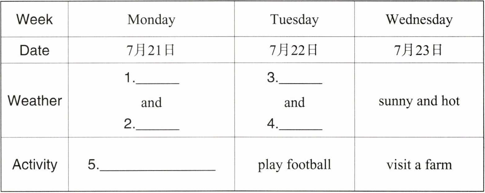 请你观察天气预报图,依据显示的天气状况来规划你的日常活动,并填写下面的表格。同时,参照给出的范例,写出你星期一的活动计划。