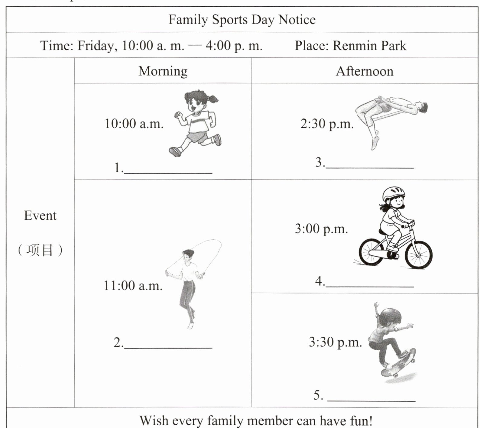 任务一:帮助 Mike 一家选择合适的人选参加比赛,并将序号填入海报中。(部分比赛不止一个人参加)