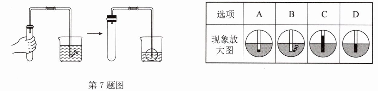 7.B 如图所示,龙龙同学采用手握试管外壁的方法检查装置的气密性,若装置的气密性良好,则将手移开一会儿后,烧杯内导管处的现象(画圈部分)是 (