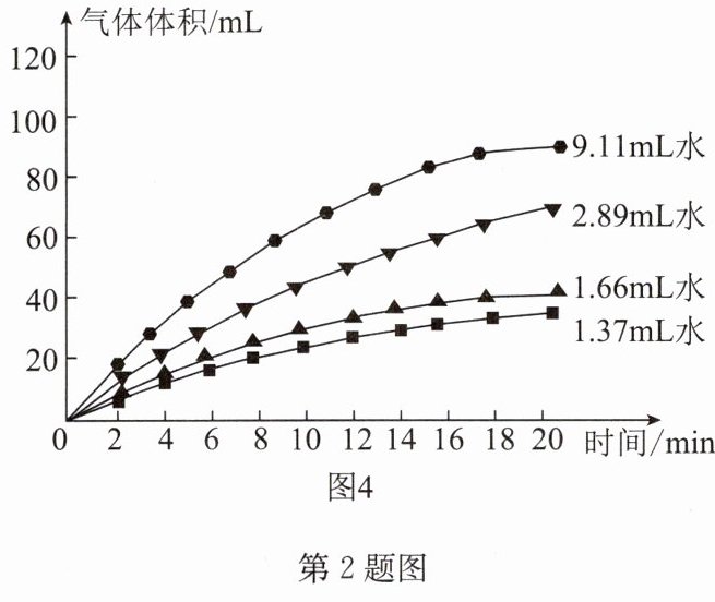 往锥形瓶中加入ag过碳酸钠、0.2g$MnO_{2}$和9.11mL水,待反应完全后收集到约159.1mL水(产生氧气的量与上表中试剂得到氧气的最大量相等)。其他试剂质量不变,再分别用不同体积的水进行实验。记录并处理20min内数据如图4。