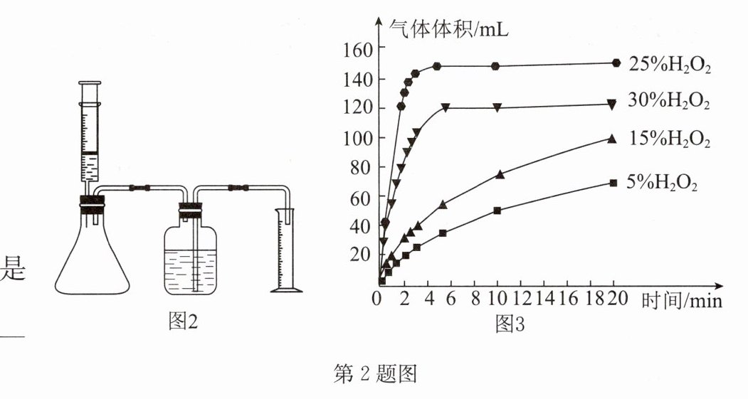 小组设计了图2实验装置,用表中溶质质量相等的四组过氧化氢溶液进行实验。在集气瓶中加满水,锥形瓶中加入0.2g$MnO_{2}$,注入溶液,记录并处理20min内数据如图3。