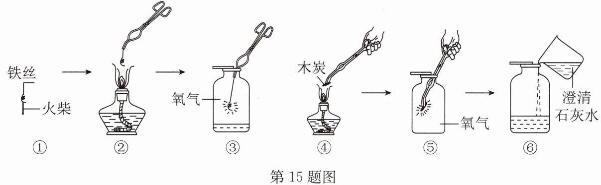 15.B 化学科学十分重视实证和理性思维,在课堂学习中,通过选用典型物质进行实验,来探究物质的有关性质。运用“比较归纳”的方法得出一些科学结论,图中所示的是探究氧气化学性质的实验。据图回答问题:
