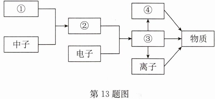 13. A (2024 春·余杭区期中)通过探究物质构成的奥秘,我们知道,物质是由原子等粒子构成的。请在如图所示方框中填写粒子名称,表示各种粒子是怎样构成物质的。
