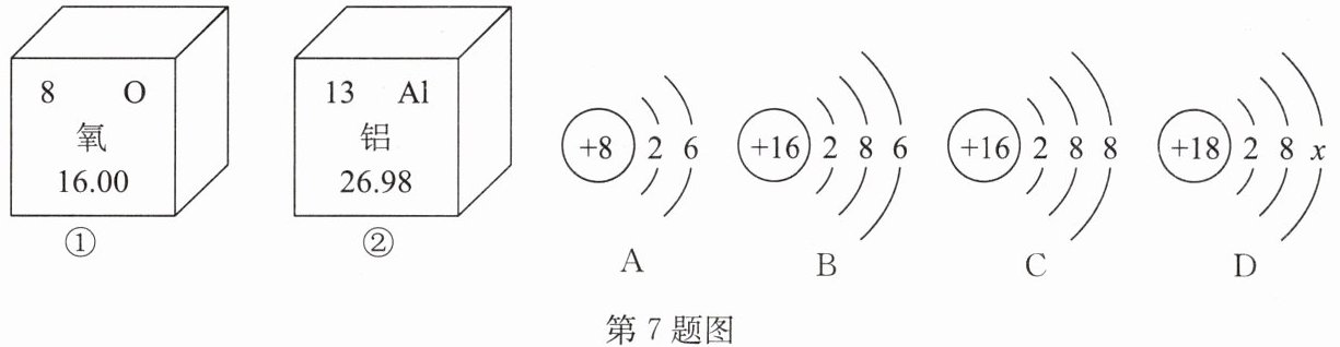 7.元素周期表是学习和研究化学的重要工具。如图中①、②为氧元素、铝元素在元素周期表中的信息示意图,A、B、C、D是四种粒子的结构示意图。试分析下图并回答问题: