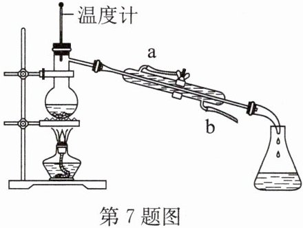 7. B (2024秋·盐山县校级月考)如图所示是实验室制取蒸馏水的装置,连接好装置,使各连接部位严密不漏气,在蒸馏烧瓶中加入几粒碎瓷片,再加入约$\frac {1}{3}$体积的自来水,加热烧瓶。下列有关实验的说法错误的是 (