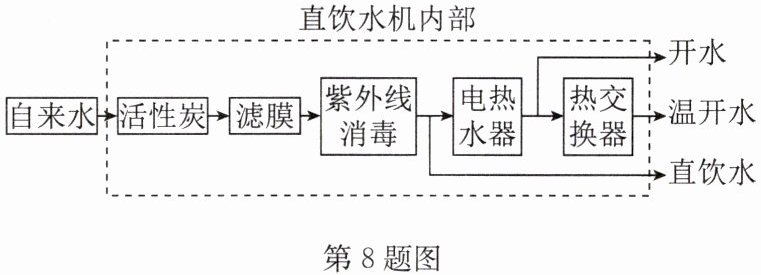 8. B 目前许多学校安装了直饮水机,只要将它与自来水连接,便可以除去水中的部分杂质得到直饮水。某品牌直饮水机的工作原理如图所示,下列说法正确的是 (