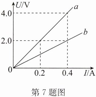 7. 小明在探究通过电阻的电流与导体两端电压的关系时,用记录的实验数据作出了如图所示的$U-I$图像,则电阻$a$的阻值为