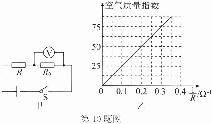 10. 如图甲所示是一个检测空气质量指数的检测电路. 其中$R$为气敏电阻,其电阻的倒数与空气质量指数的关系如图乙所示,已知电源电压为$6V$且保持不变,$R_{0}= 2.5Ω$.当闭合开关$S$后,电压表的示数为$2V$时,求: