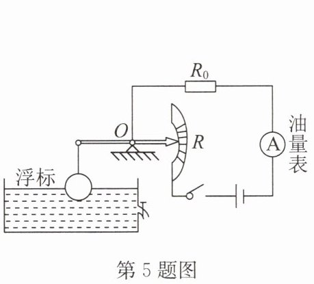 5. 如图所示是小明自制的一种测定油箱内油面高度的装置.油量表是由量程为0~0.6A的电流表改装而成的,滑动变阻器R的最大阻值为20Ω,从油量表指针所指的刻度就可以知道油箱内油面的高度.已知电源电压为12V,当油箱内油面高度最高时,R的金属滑片在最下端,油量表指针满偏;当油箱内没有油时,R全部接入电路,油量表的读数最小.则$R_{0}$的阻值是