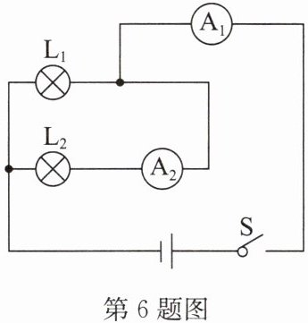 6. 如图所示,闭合开关S,电流表$A_{1}$的示数为1.5A,电流表$A_{2}$的示数为0.9A.下列说法正确的是 (
