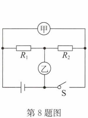 8. 如图所示的电路中,电源电压保持不变.当开关S断开,甲、乙两电表为电流表时,两电表的示数之比$I_{甲}:I_{乙}$为3:5,则$R_{1}:R_{2}= $