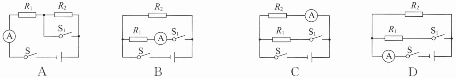 11. 下列各电路中,电源电压不变.先闭合开关S,再闭合开关$S_{1}$,电流表示数不变的是 (