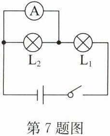 7. 如图所示,粗心的小强把电流表并联接在了$L_2$的两端. 如果闭合开关,将会发生(