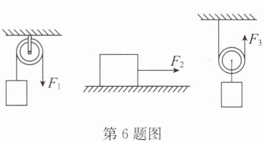 6. 在如图所示的三种场景中,拉力$F_{1}$、$F_{2}$、$F_{3}$的大小相等,在拉力的作用下物体移动的距离也相等.若拉力所做的功分别记为$W_{1}$、$W_{2}$、$W_{3}$,下列关于它们大小关系的判断中正确的是 (