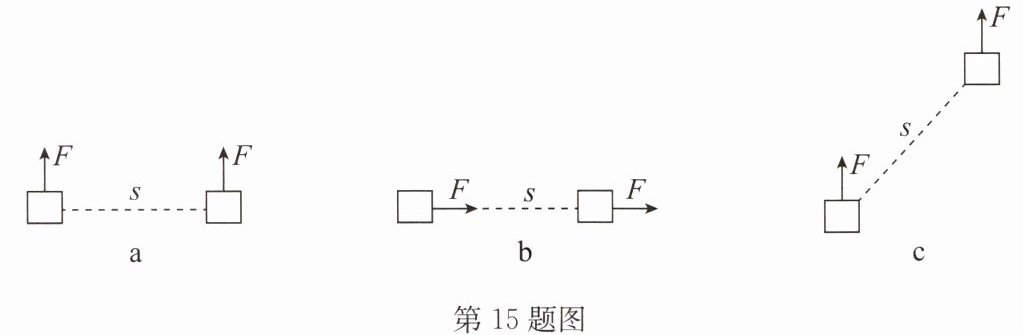 15. (2024·秦淮区月考)如图所示,a、b、c三种情况下,用大小相同的力F使同一物体沿不同的轨迹移动了相同的距离s,对于三种情况下拉力F所做的功分析正确的是 (