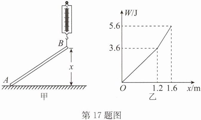 17. 一根金属棒AB置于水平地面上,通过弹簧测力计竖直地将金属棒的右端B缓慢拉起,如图甲所示,在此过程中,弹簧测力计对金属棒所做的功W与B端离开地面的高度x的关系如图乙所示,请根据图像解答下列问题.