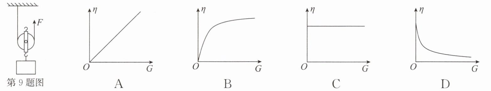 9. 如图所示,用手沿竖直方向匀速拉一个动滑轮,使挂在下面重为G的物体缓慢上升,动滑轮的重力不可忽略,现改变物体的重力G,不计绳重与摩擦,则动滑轮的机械效率$ \eta $与物体重力G的关系可能符合下列图中的 (
