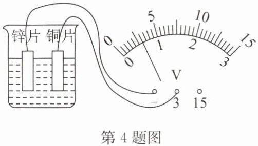 4. 如图所示,在烧杯中加入盐水,将铜片和锌片插入盐水中,这就组成了一个电池。观察电压表指针的偏转与接线可知,这个电池的电压为
