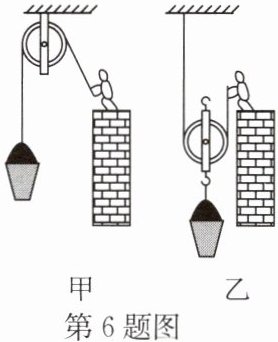 6. 如图所示,小明分别用甲、乙两个滑轮把同一桶沙子从地面匀速提到二楼,用甲滑轮所做的总功为$W_{1}$,机械效率为$\eta _{1}$;用乙滑轮所做的总功为$W_{2}$,机械效率为$\eta _{2}$,若不计绳重及摩擦,则 (