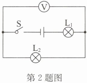 2. 如图所示,电源电压为9V且保持不变,当开关S闭合时,灯泡$L_{1}$、$L_{2}$均正常发光,电压表的示数为3V,则灯泡$L_{1}$两端的电压是