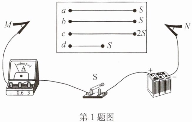 1. 在探究导体的电阻与哪些因素有关的问题时, 小明进行了如下实验. 如图所示, 实验板上固定了四根金属丝. $a$、$c$、$d$为镍铬合金丝, $b$为铜丝; $a$、$b$、$c$的长度相同, $d的长度小于a$的长度; $a$、$b$、$d$的横截面积相同, $c的横截面积大于a$的横截面积.