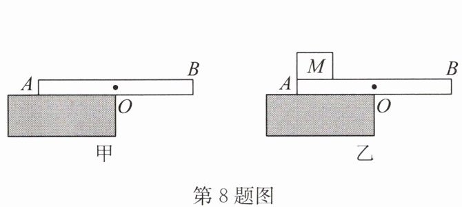 8. (2024·滨海县模拟)图甲中均匀木板$AB重为8N$、长为$20cm$,恰好有一半伸出水平桌面静止,在$B端施加一个始终竖直向上的力F$,当$F= $
