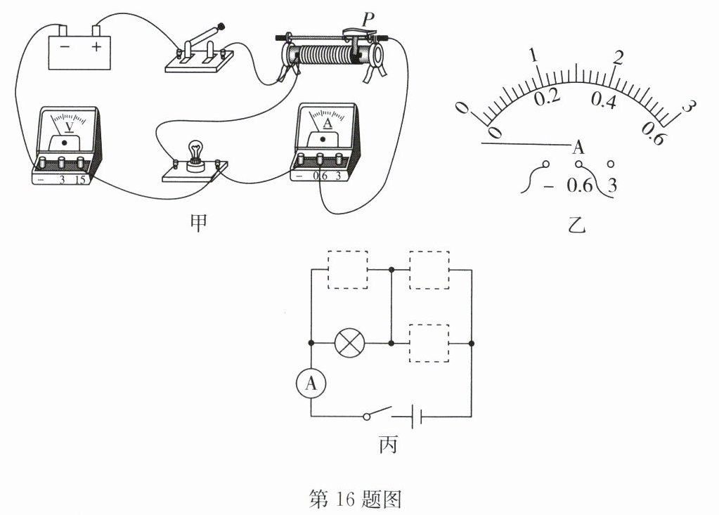 个器材,并将它们的电路元件符号填入图丙中合适的虚线框中,请帮助小红完成电路设计.