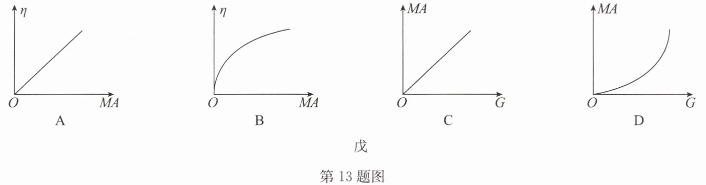 J.(g取10N/kg,不计绳重)(5)物理学中把机械对重物施加的力与人对机械施加的力的比值叫作机械效益MA,用于比较不同机械的省力程度.现用图甲所示滑轮组匀速提升重物,不计绳重和摩擦.则下列描述滑轮组的机械效率η与机械效益MA、机械效益MA与物体重力G的关系图线中,可能正确的是