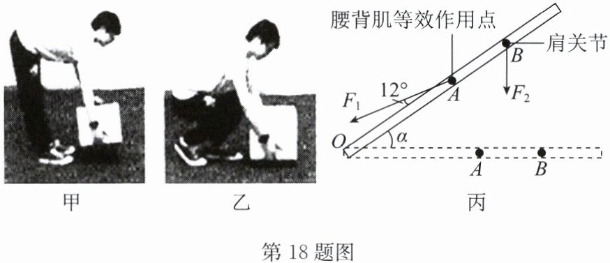 从地面上搬起重物我们的常见做法是弯腰(如图甲)或下蹲弯曲膝盖(如图乙)把它搬起来,哪种方法好呢?下面就建立模型说明这个问题。把脊柱简化为杠杆如图丙所示,脊柱可绕骶骨(轴)O转动,腰背部复杂肌肉的等效拉力$ F_{1} $作用在A点,其实际作用方向与脊柱夹角为$ 12^{\circ} $且保持不变,搬重物时拉力$ F_{2} $作用在肩关节B点,在B点挂一重物。用测力计沿$ F_{1} $方向拉,使模型静止,可测出腰背部复杂肌肉拉力的大小。接着,改变脊柱与水平面的夹角即改变杠杆与水平面的夹角α,多次实验得出结论。