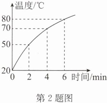 2. 某物理兴趣小组的同学用煤炉给水加热,同时他们绘制了如图所示的加热过程中水温随时间变化的图线,若在6min内完全燃烧了0.2kg的煤,水的比热容为$4.2×10^3J/(kg·℃),$煤的热值约为$3×10^7J/kg.$求: