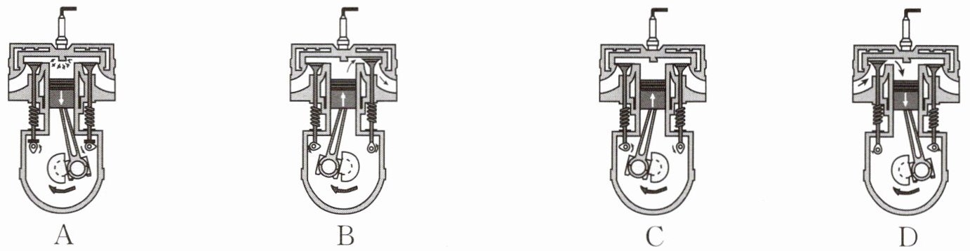 7. (2024·临沂)2024年4月20日,我国研制的全球首款本体热效率达53.09%的柴油机正式亮相世界内燃机大会,刷新了柴油机热效率的世界纪录. 下列内燃机的四个冲程中,汽缸内气体的内能最小的是 (