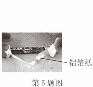 5. 如图所示是小明的物理老师在课堂上演示的一个实验。把一张细条状的铝箔纸两端分别压在干电池的正负极上,不一会儿,铝箔纸就燃烧了起来。这是由于电源发生了