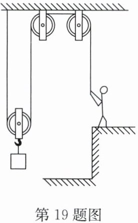 19. (8分)工人师傅用如图所示滑轮组提升建筑材料,用400N的拉力使重为700N的建筑材料匀速竖直上升了3m,用时50s.不计绳重和摩擦,绳子能承受的拉力足够。求该过程中: