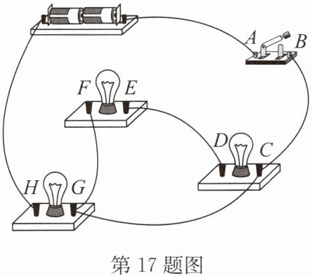 17. 如图所示电路,在某些接线柱间去掉或添加一根导线,可使三盏灯泡分别成为串联或并联.