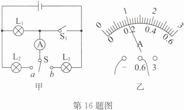 16. (2024·大丰区期中)如图甲所示,当开关S接a、$S_1$闭合时,电流表的示数如图乙所示,电路中