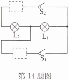 14. 如图所示,请在两个虚线框内填“电源”和“电流表”的符号,使开关都闭合时两灯均能工作.