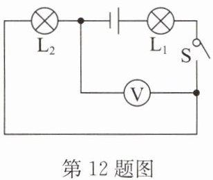 12. 如图所示的电路图中,当开关S闭合后,灯$L_{1}和L_{2}$是