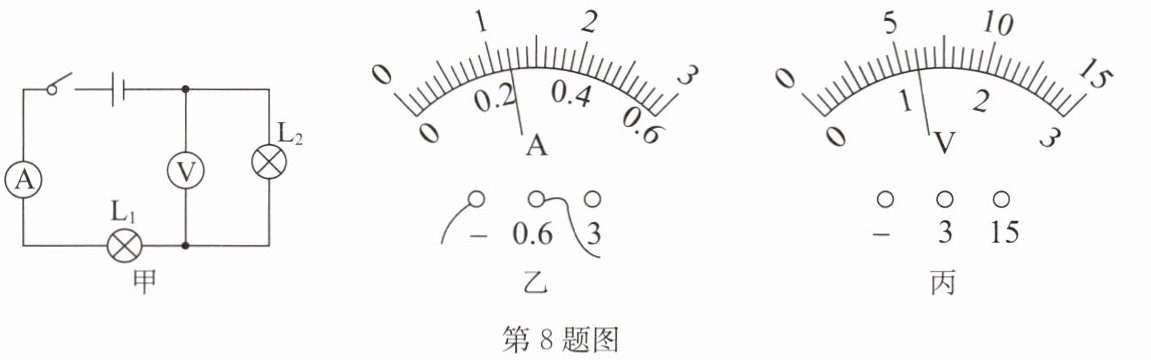 8. 如图甲所示的电路中,电源由三节新干电池(每节均按1.5V计)串联组成.闭合开关后,两只灯泡均发光,电流表的示数如图乙所示,电压表V指针的位置如图丙所示.则: