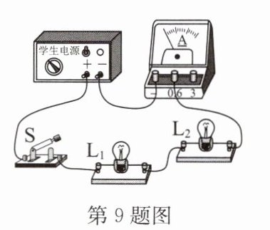 9. 如图所示,标有“2.5V 0.3A”字样的灯泡$L_{1}$和标有“6V 0.15A”字样的灯泡$L_{2}$连接成串联电路,电源电压可调节.闭合开关S,使电源电压从0V逐渐增加,先正常发光的灯泡是