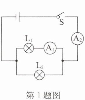 1. 如图所示,闭合开关S后,灯$L_{1}$、$L_{2}$均能发光,若电流表$A_{1}$的示数为0.3A,电流表$A_{2}$的示数为800mA,则通过灯$L_{1}$的电流为