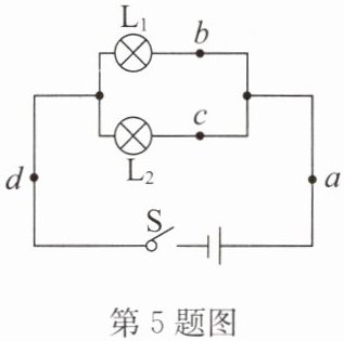 5. 如图所示是探究并联电路中电流的关系的电路图.$L_{1}与L_{2}$是两个不同规格的小灯泡,闭合开关后,通过a、b、c、d四处电流的大小关系正确的是(