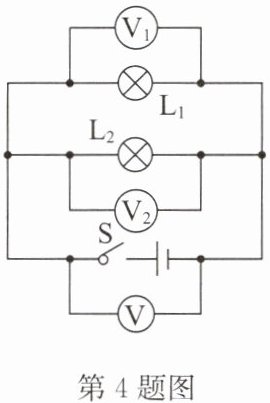 4. 如图所示,闭合开关S后,灯泡$L_{1}比L_{2}$亮,电压表$V_{2}$的示数为6V,下列说法正确的是(